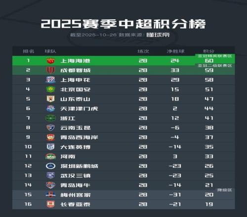 目前,上海海港以60分、净胜球+24位居积分榜第一名,成都蓉城以58分、净胜球+33位居第二名,而上海申花则是以58分、净胜球+29位居第三名。